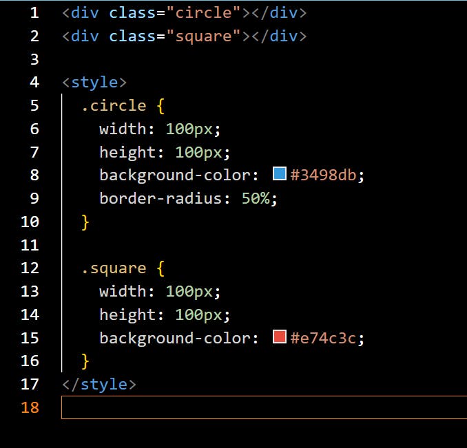 In this example, the circle is made by giving the div a border-radius of 50%, transforming the square shape into a circle. The square is simply a block element with equal width and height.