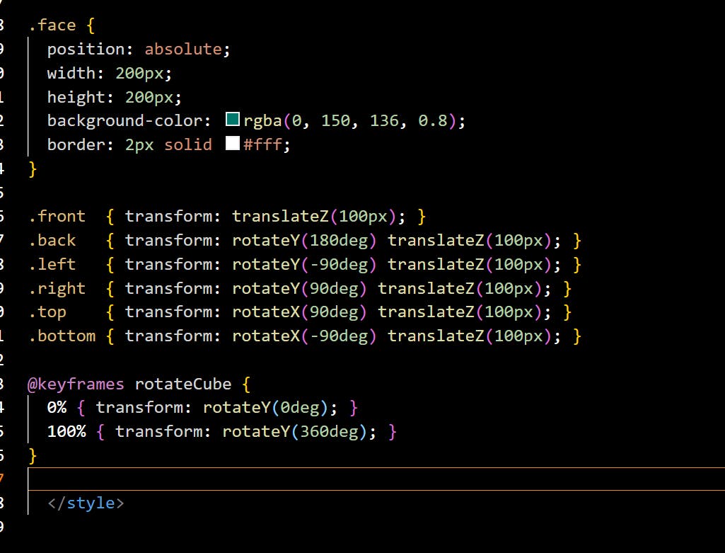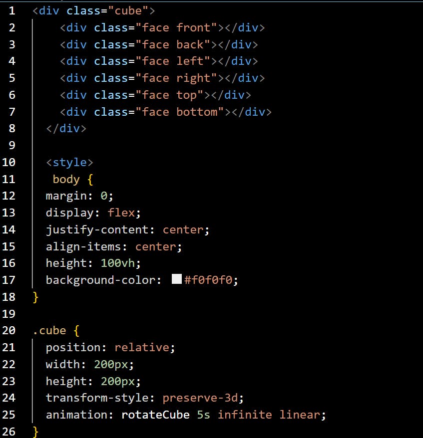 Here’s the code to create a cool rotating 3D cube using pure CSS. The cube will continuously rotate on its axis, giving it a 3D effect.